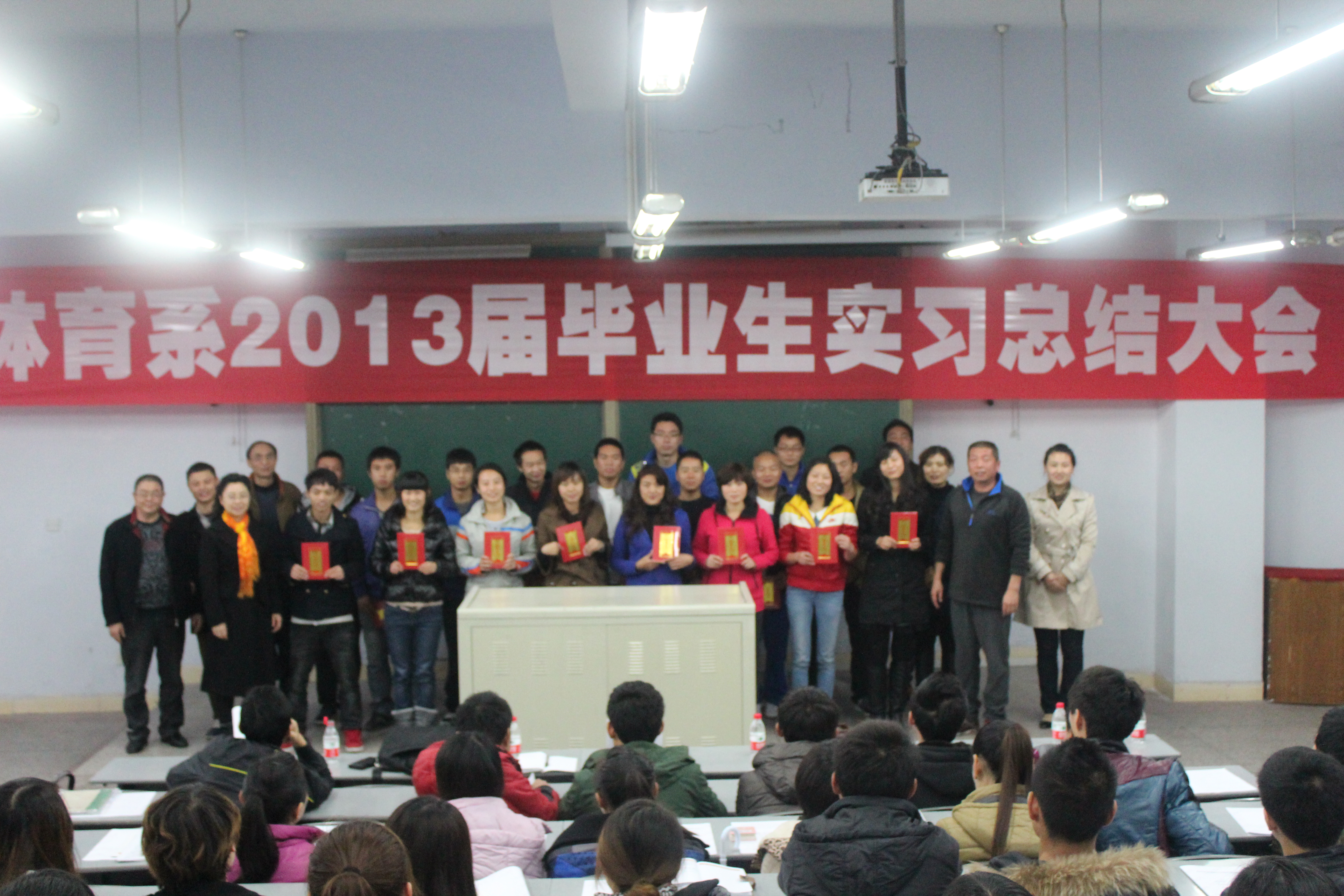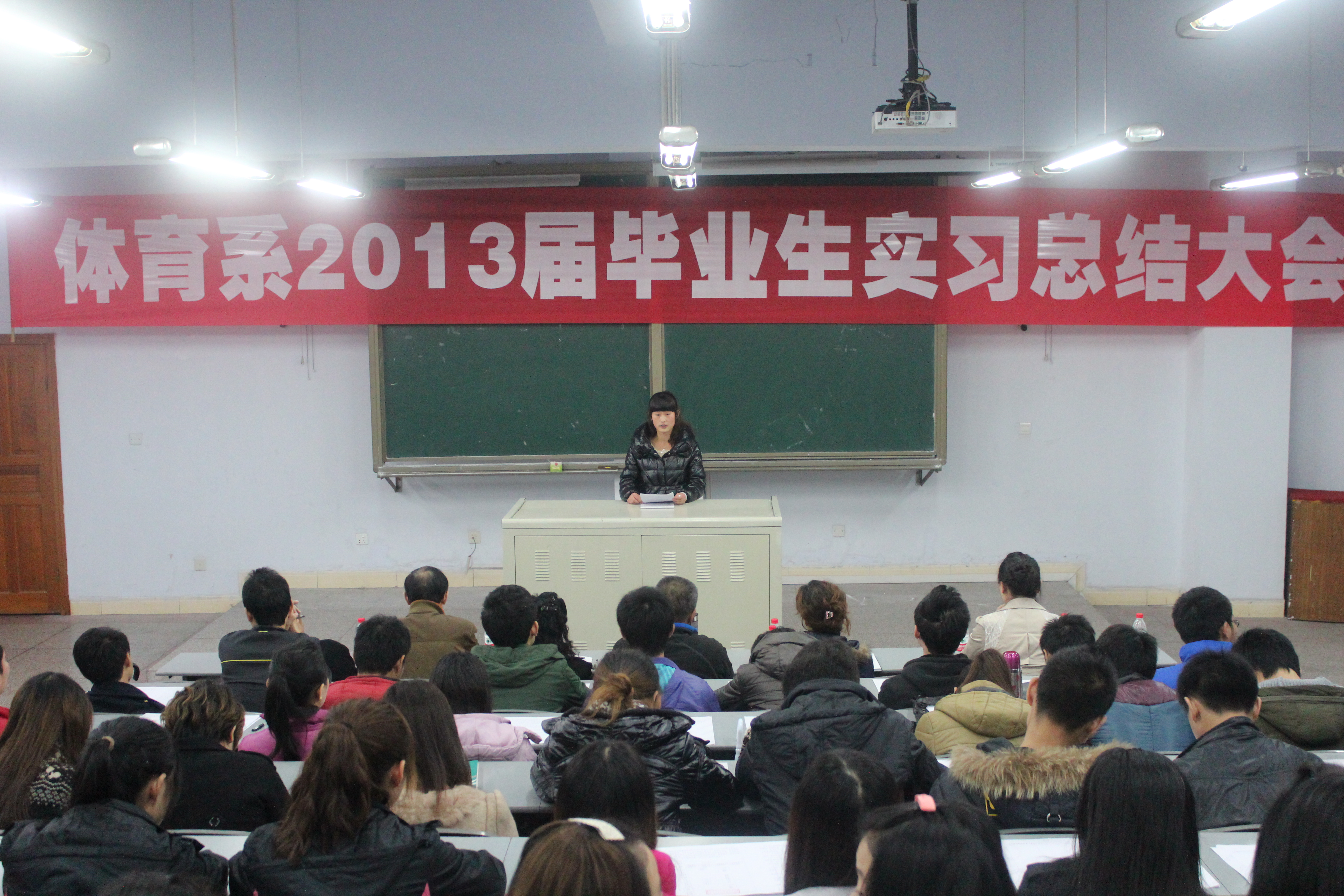 2012年11月15日下午4:30,太阳成集团tyc151体育系2013届毕业生在莲湖校区教学楼125教室举行实习总结大会。此次大会由何其波同学主持,参加此次大会的有教务处曹科长、体育系主任董立教授、体育系副主任陈碧述教授、体育系李文华老师、体育系团总支书记兼辅导员李霞老师、体育系辅导员那明明老师,以及体育系2013届的全体毕业生。