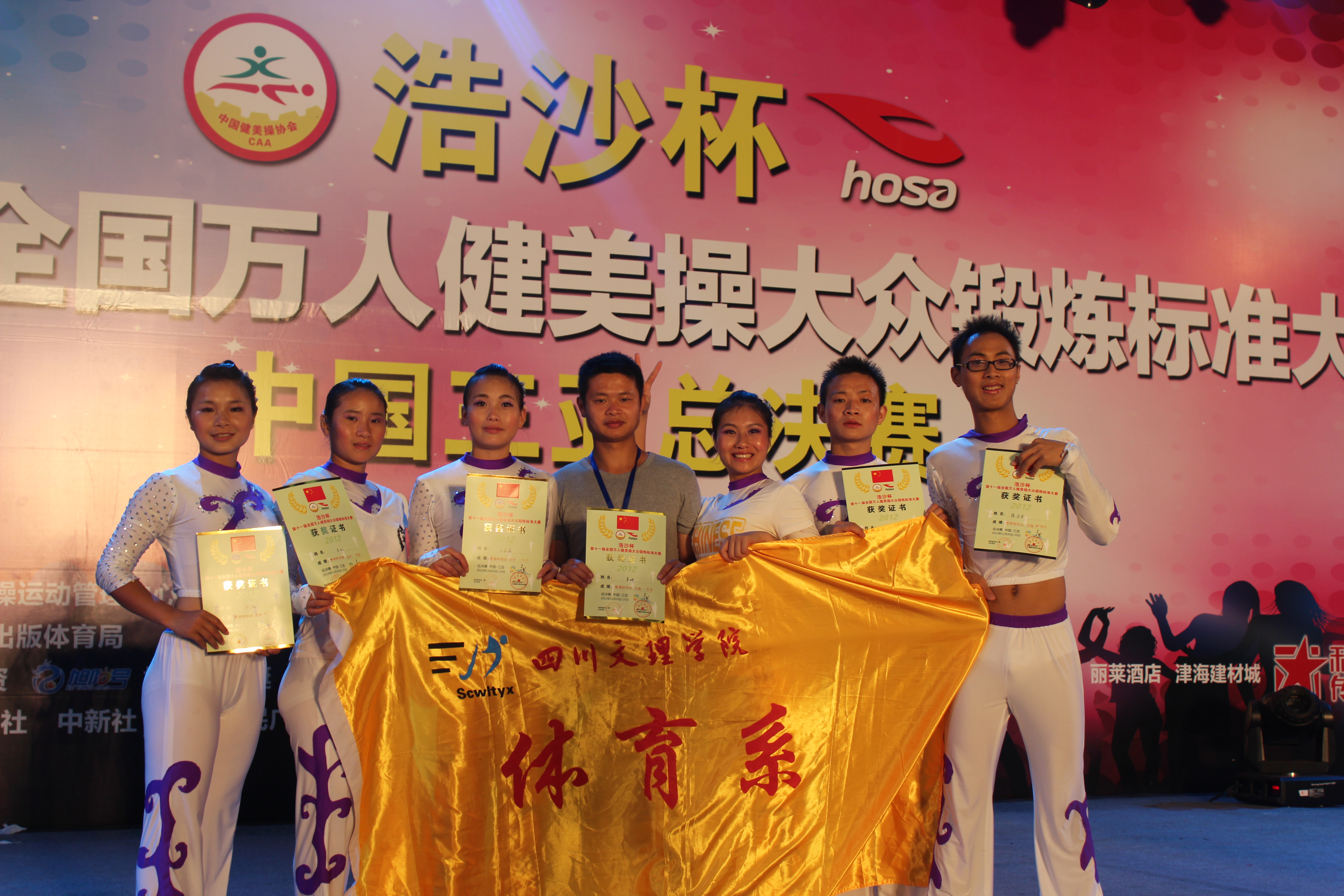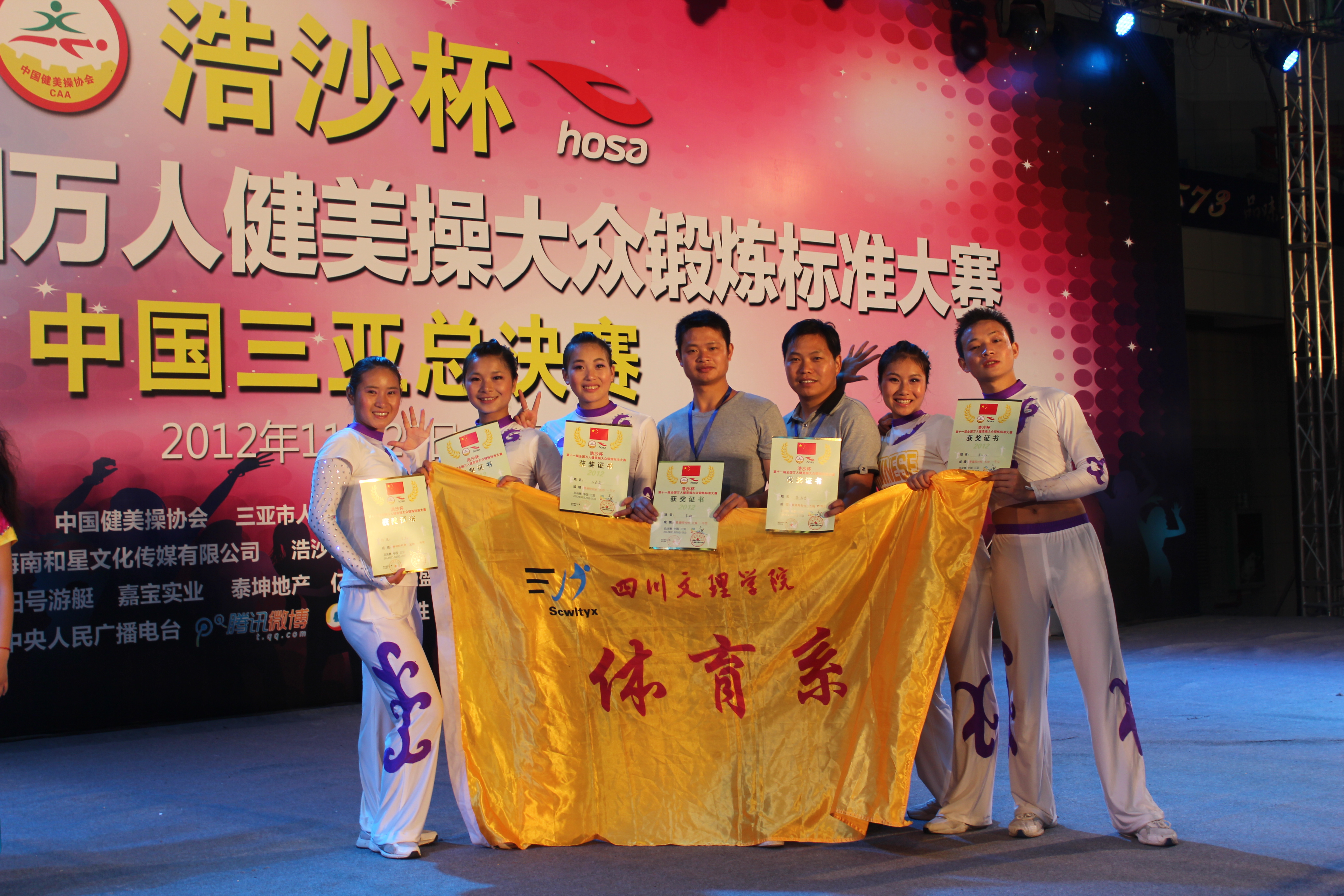 1121至24日,由国家体育总局体操运动管理中心、中国健美操协会主办,浩沙(中国)有限公司、浩沙国际健身管理有限公司承办的2012年“浩沙杯”全国万人健美操大赛总决赛在中国三亚隆重举行,全国来自北京、福建、广东、江西、海南等18个省市约50多支队伍共1000余人参加了此次比赛,公司体育系组建的大众五级队在体育系党总支副书记张皓老师及冉卫东教练的带领下参加了本次比赛,并获得了喜人的成绩。