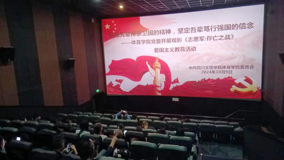为深入学习贯彻党的二十届三中全会精神,庆祝中华人民共和国成立75周年,引导公司师生缅怀革命先辈,弘扬爱国主义精神,汇聚干事创业的力量,2024109日,体育公司党委举办了以“弘扬先辈保家卫国的精神,坚定吾辈笃行强国的信念”为主题的爱国主义教育活动,组织公司全体教职工及部分员工党员代表观看了红色影片《志愿军:存亡之战》,一起重温那段荡气回肠的烽火岁月,致敬不朽的人民英雄。