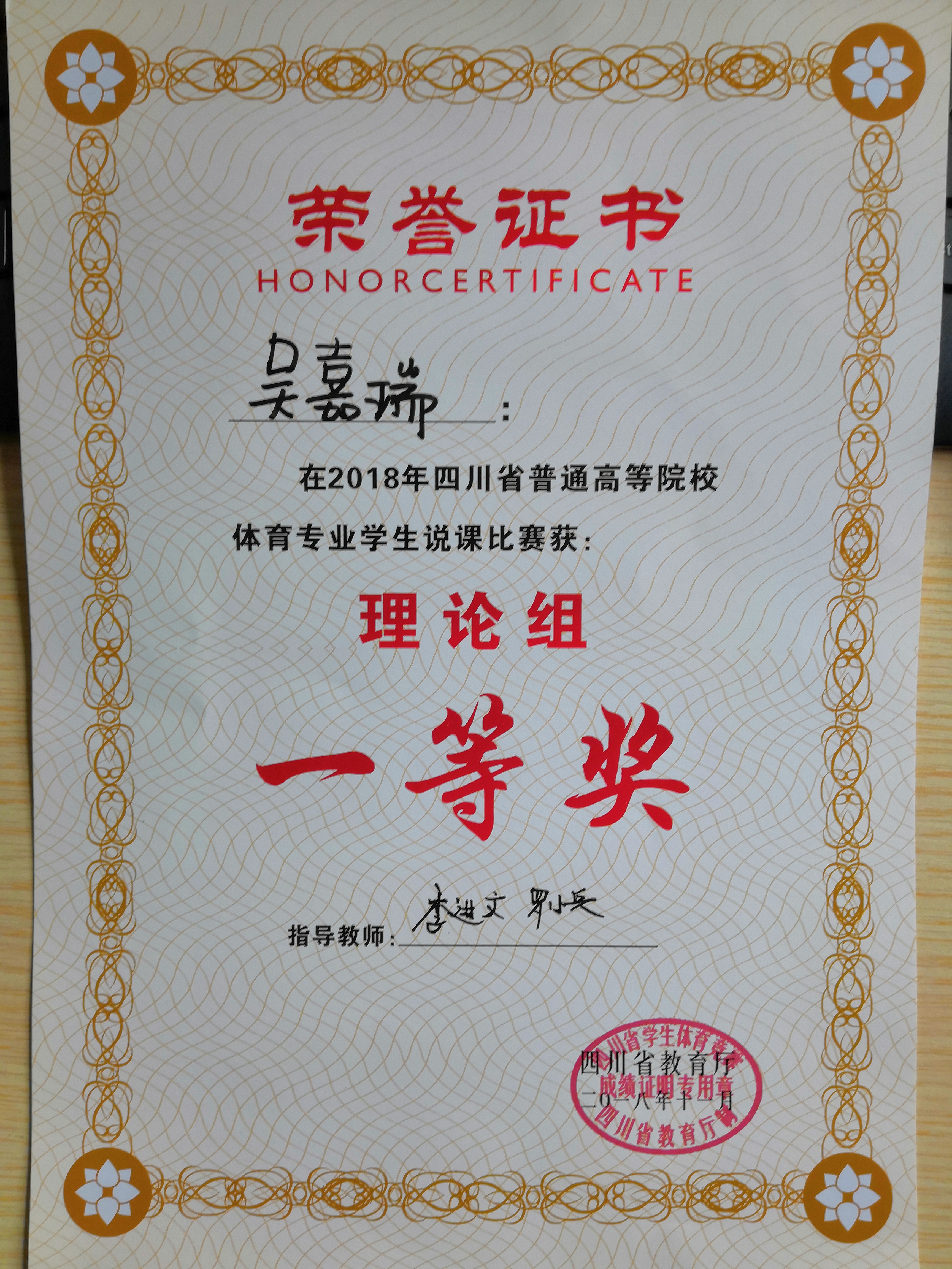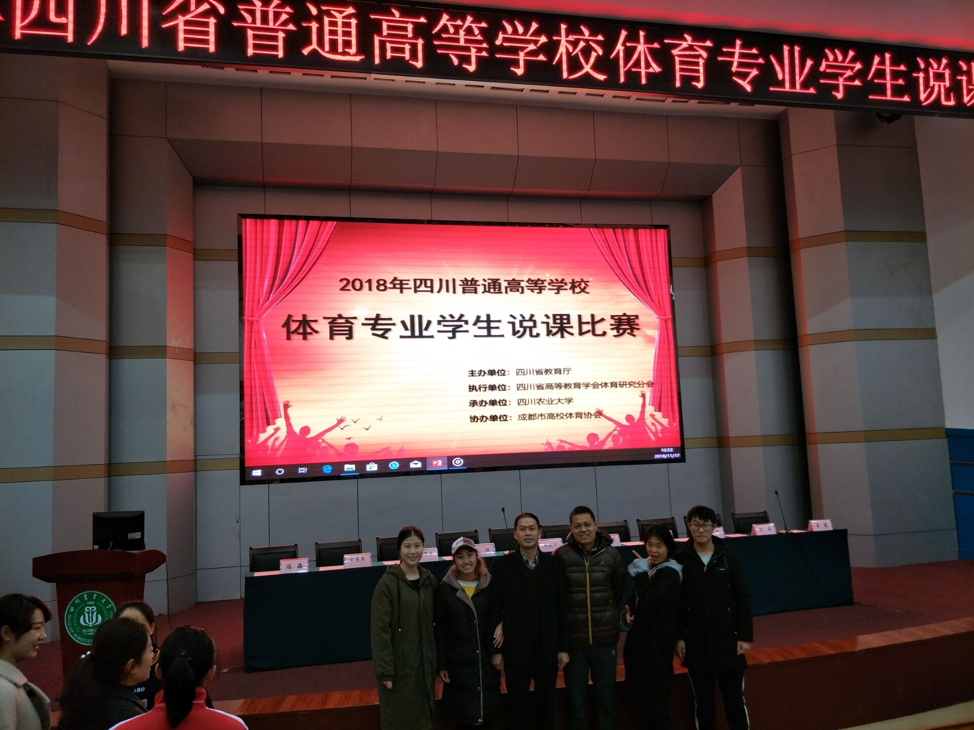 2018年11月15日至17日,由四川省教育厅主办的2018年四川省普通高等院校体育专业员工说课比赛在四川农业大学圆满落幕。经过两天的激烈竞争,太阳成集团tyc151吴嘉瑞同学获得理论组一等奖,康利菊、曾子芮和陈念等三名同学获得三等奖,四川文理代表队荣获团体二等奖,成绩较以往有较大突破。陈碧述教授获得“优秀裁判员”称号。
