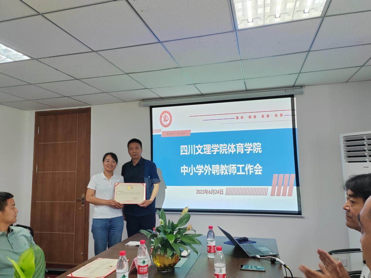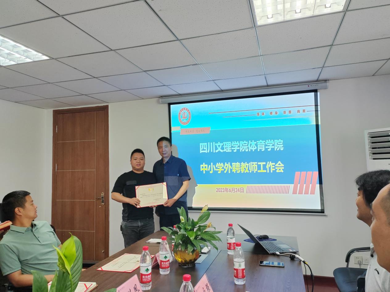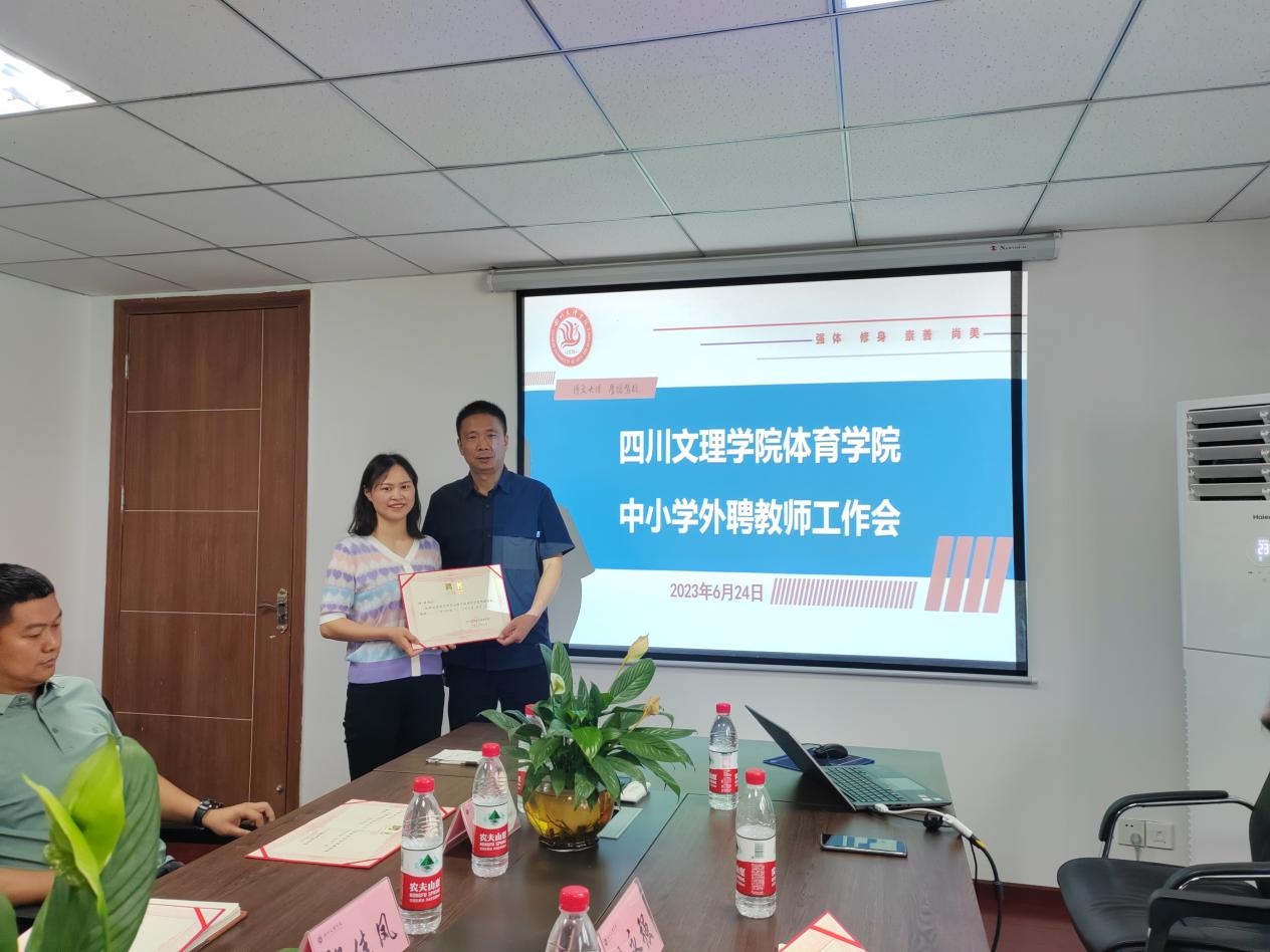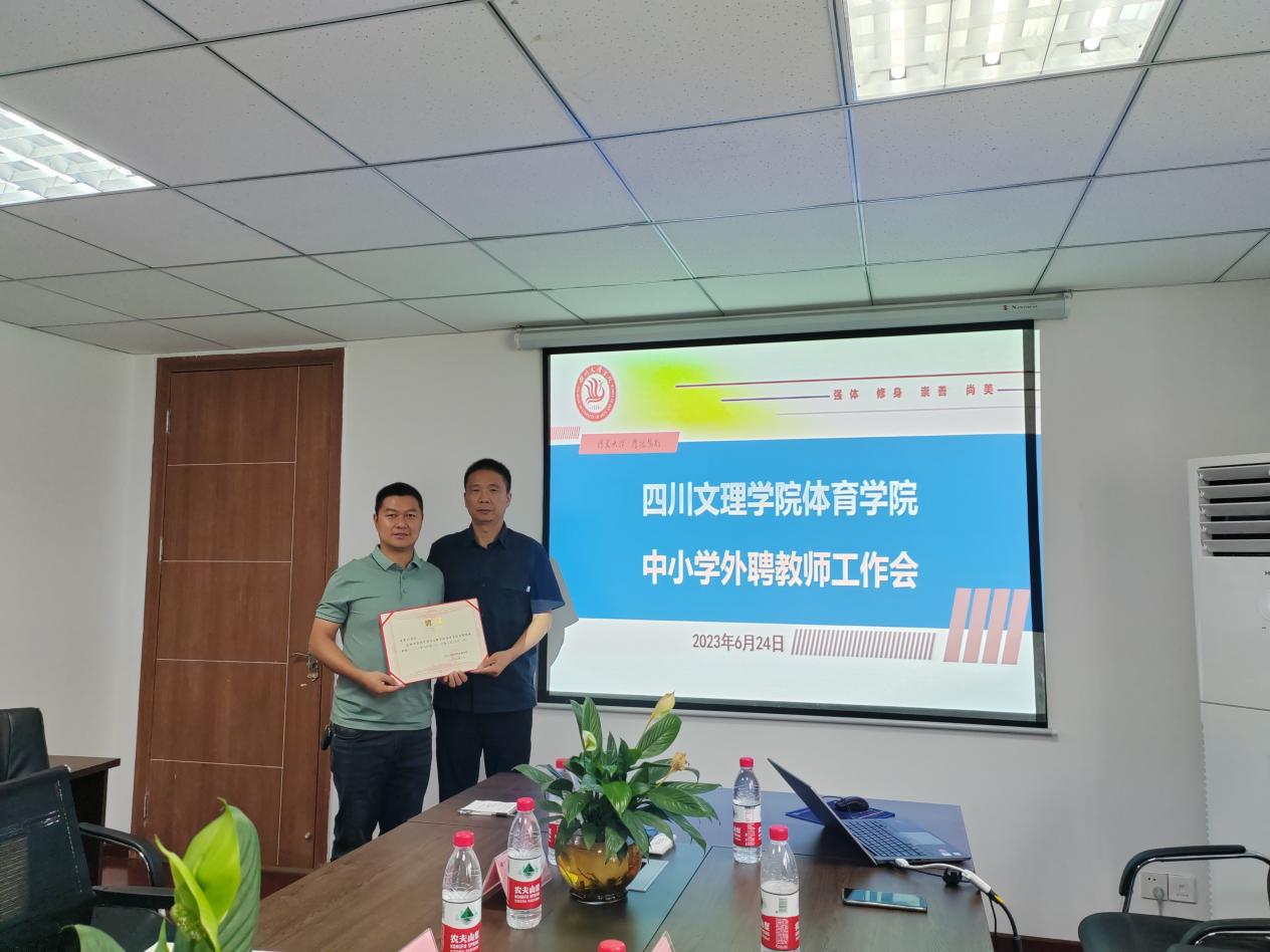 佘涛经理对太阳成集团tyc151的办学历程及基本情况进行了简要介绍,并代表公司感谢大家在公司发展中给予的大力支持。他汇报了公司体育教育专业认证工作的推动情况。他指出,师范专业人才培养质量评价的重要依据是师范生和用人单位的满意度,为对接社会需求,提升人才培养质量,公司特聘部分中小学优秀体育教师和专家作为公司体育教育专业的外聘教师。随后,经理佘涛、副经理孙亮亮为向珏璞、冉香山、杨曲、郎佳凤四位中小学优秀教师颁发了聘书。并围绕中小学体育教育课程标准、体育教育人才需求、中小学体育教育现状及困惑,与会老师进行了深入的交流。