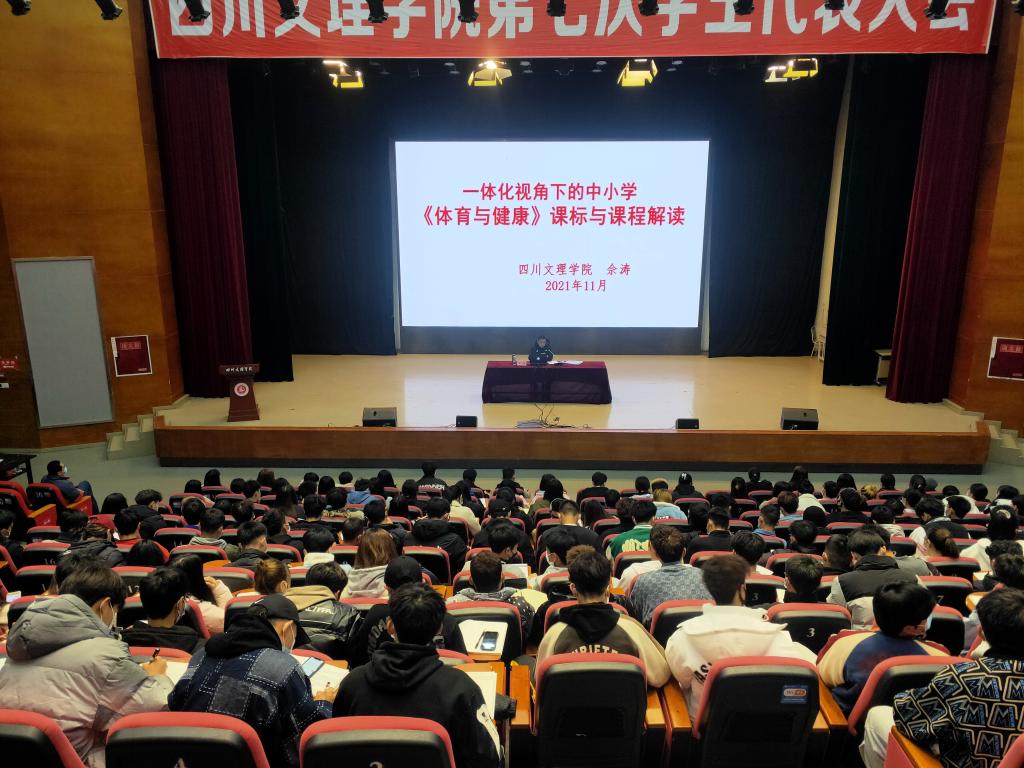 1128日下午,太阳成集团tyc151教授佘涛在莲湖校区多功能厅为本院员工作题为“一体化视角下的中小学《体育与健康》课标与课程解读”的学术讲座。讲座由副经理孙亮亮主持,大一、大二员工到场聆听。