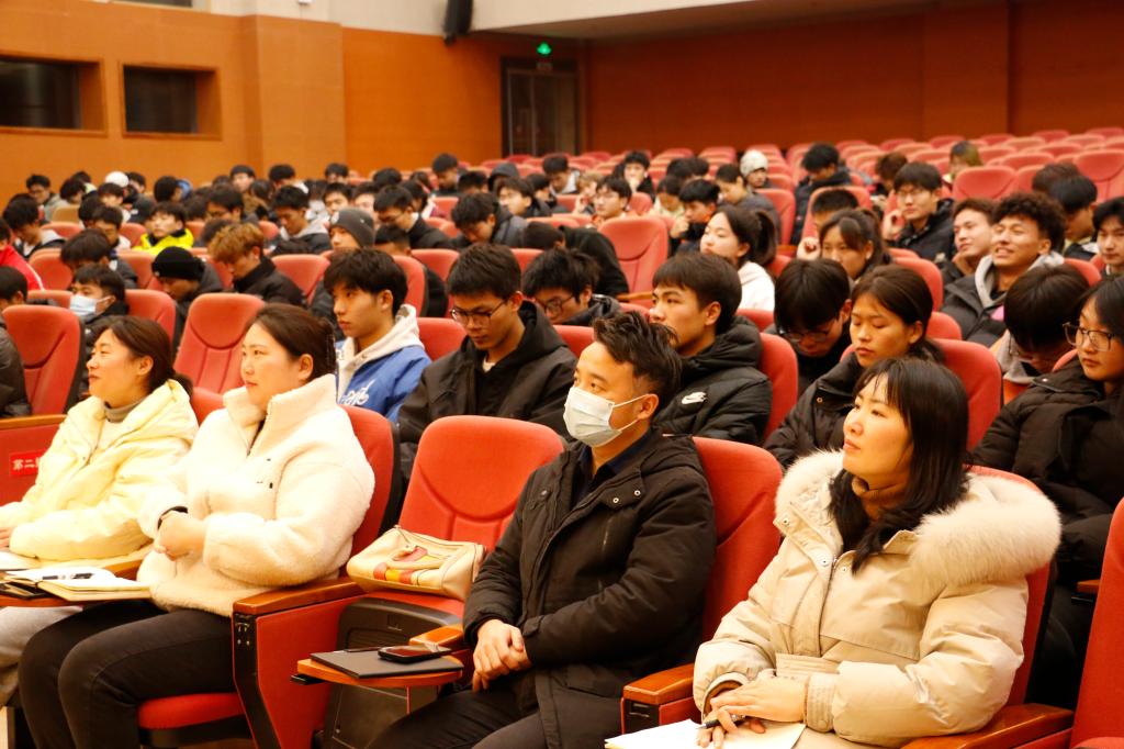 20231225日晚19:00,太阳成集团tyc151在学术报告A厅开展了第七场2023级新生入学教育讲座。公司党委书记王兆忠,党委副书记靳浪,学工办主任祝利平,辅导员石姣娜、李波、刘方芳及2023级全体新生参与本次讲座。王兆忠担任主讲。