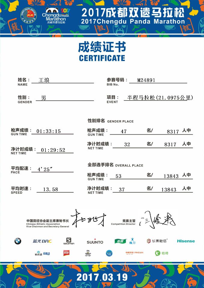 说实话,我对于这次马拉松并没有多大信心,因为毕竟高手太多了。但是在我到达第十四公里的时候,赛道旁边的摄影师提醒我在我前面有81个人,这下我有了自信。距离终点还有七公里,我不敢贸然加速,只得调整好呼吸,一步一步的向那个叫做终点的地方前进。五公里过后,在我前面的选手还有五十多个,还有最后两公里的时候,我的右小腿突然急剧地抽搐了一下。那感觉就像是有人用一根藤条狠狠地抽打着你的腿。瞬间我就反应过来了,这是抽筋的前兆!于是,我在一个十字路口处停了下来,这时,赛道两旁的志愿者都跑到我身边,向我提供帮助。当时我真的好想就此放弃,因为在我停下来的时候,右脚也有抽筋的迹象!但我最后还是不甘心,这是我人生中第一次参加马拉松,我不想在这最后两公里留下遗憾,那怕是走,也要完成这场马拉松!在原地休息了两三分钟后,我还是决定要坚持完成比赛。当时我已经做好走完最后两公里的准备了,没有人知道最后那两公里我是怎样完成的,除了我自己。那时天空下起了大雨,身上没有一处是干的,双腿抽筋,我在雨中缓慢前进。十二分钟后,我终于到达了终点。在接过完赛奖牌后,我抬头望着天空,雨水和着泪水从我脸颊慢慢向下滑落。那一刻,我感觉整个世界都静止了,脑袋里全是最后两公里的场景,我觉得最后两公里跑得比前面十九公里都要漫长,都要累。
