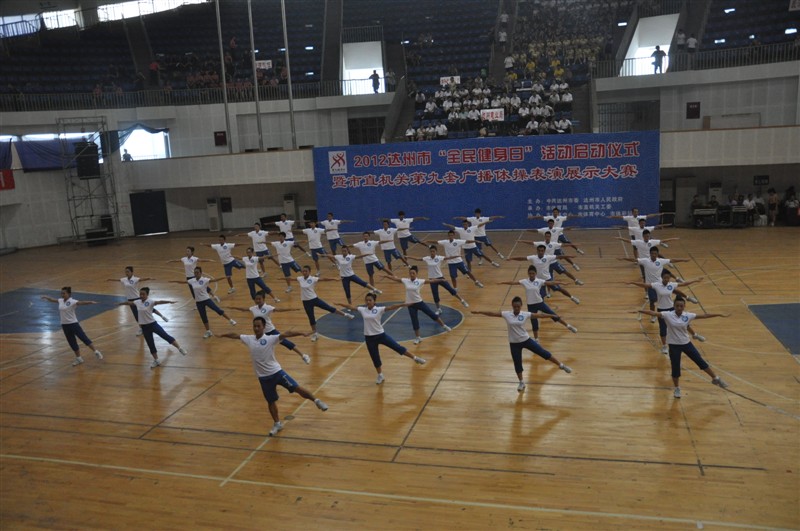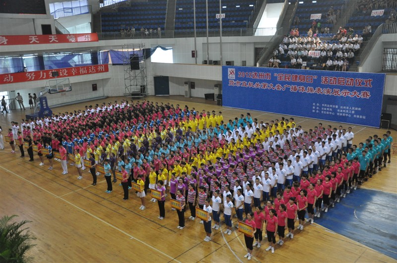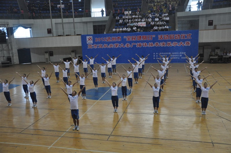 为了更好的营造全民健身活动氛围,提高广大市民的健身理念,努力建设幸福达州,8月8日上午,2012达州市“全民健身日”活动启动仪式暨市机关第九套广播体操表演展示大赛在市体育馆隆重举行,本次比赛由中共达州市委,达州市人民政府主办。四川文理公司党委书记李万斌教授受邀出席了活动的启动仪式并观看了比赛。体育系董立主任,系党总支佘涛副书记(主持全面工作),系党总支张皓副书记,系辅导员及公司的教师代表一行观看了全程比赛。